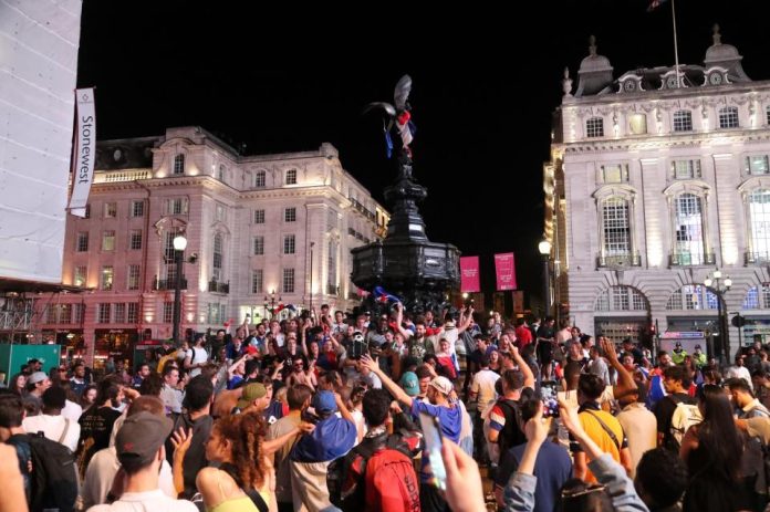 Tusentals Frankrikes fans kom ner på Piccadilly Circus för att fira VM -segern