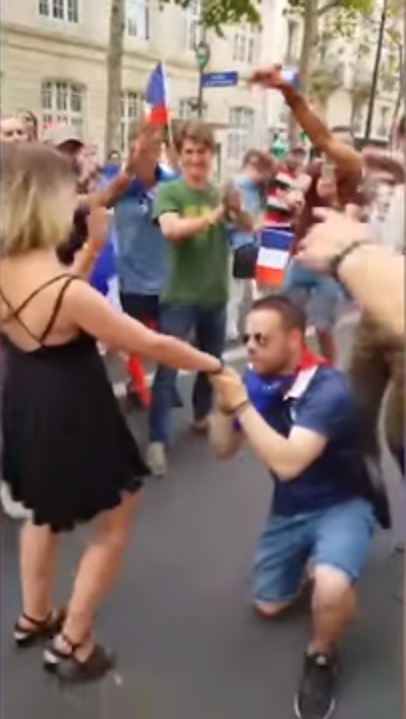 Loïc Séverin firade Frankrikes slutliga seger nära Champs-Élysées när han upptäckte den kollega supporteren draperade i en flagga framför en kvinna.