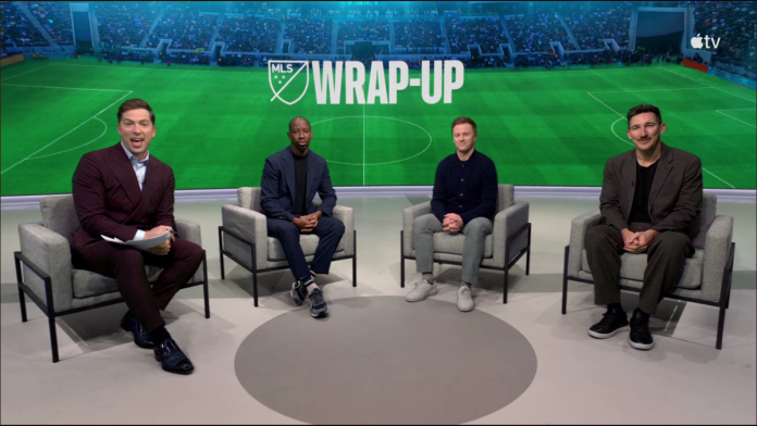 Från höger until vänster: Sacha Kljestan, Dax McCarty och Bradley Wright-Phillips tillsammans med värd Kevin Egan (kredit: MLS-säsongspass på Appletv)