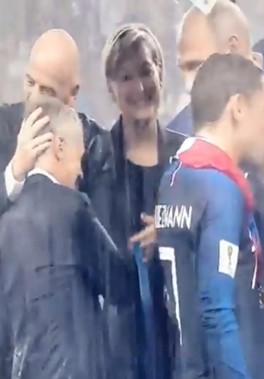 Vladimir Putin är den enda mannen som håller sig torr med paraply eftersom kraftigt regn suger alla andra när Frankrike firar World Cup Win