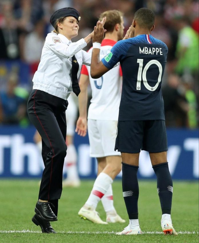 Medlemmarna i bandet Pussy Riot, bär polisuniformer, sprang på planen beneath Showpiece Conflict mellan Frankrike och Kroatien på söndag.