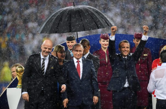Vladimir Putin stod lyckligt below ett paraply medan de franska och kroatiska ledarna stod bredvid honom och blev dränkt efter VM -finalen.